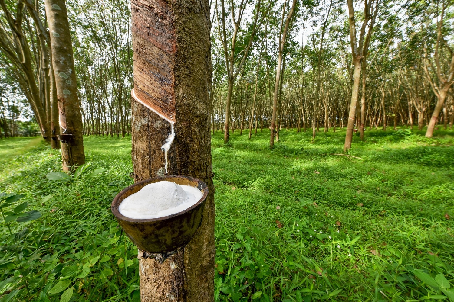 Lateks se pridobiva z obrezovanjem dreves kavčukovca. Drevo se z obrezovanjem smoli, ob tem pa se izloča sok. Po večini je sok, ki se izloča, bele barve, ni pa nujno. Sok gre potem naprej v predelavo v tovarne, kjer iz njega nastane čisti lateks, iz katerega izdelujejo ležišča in vzglavnike.