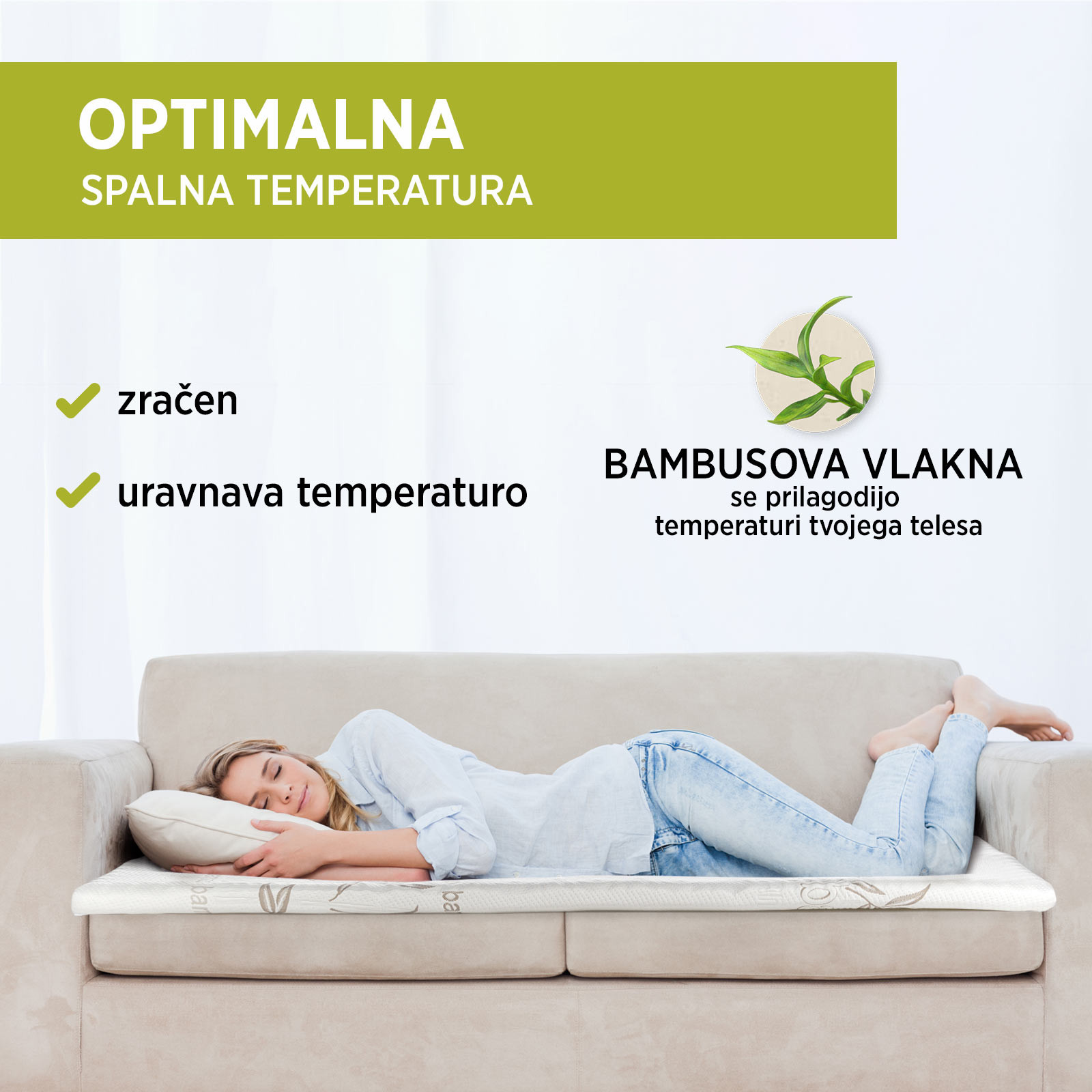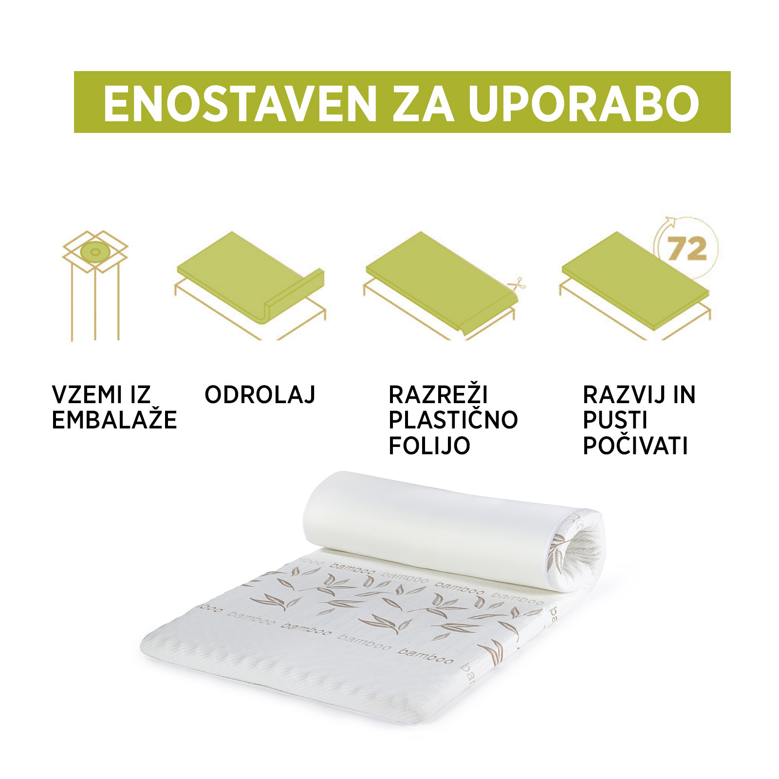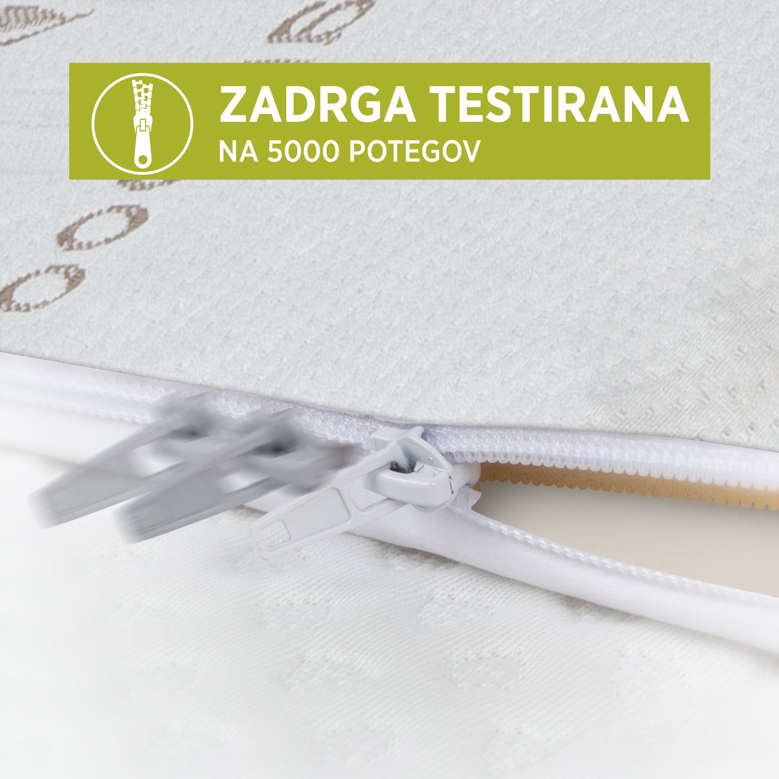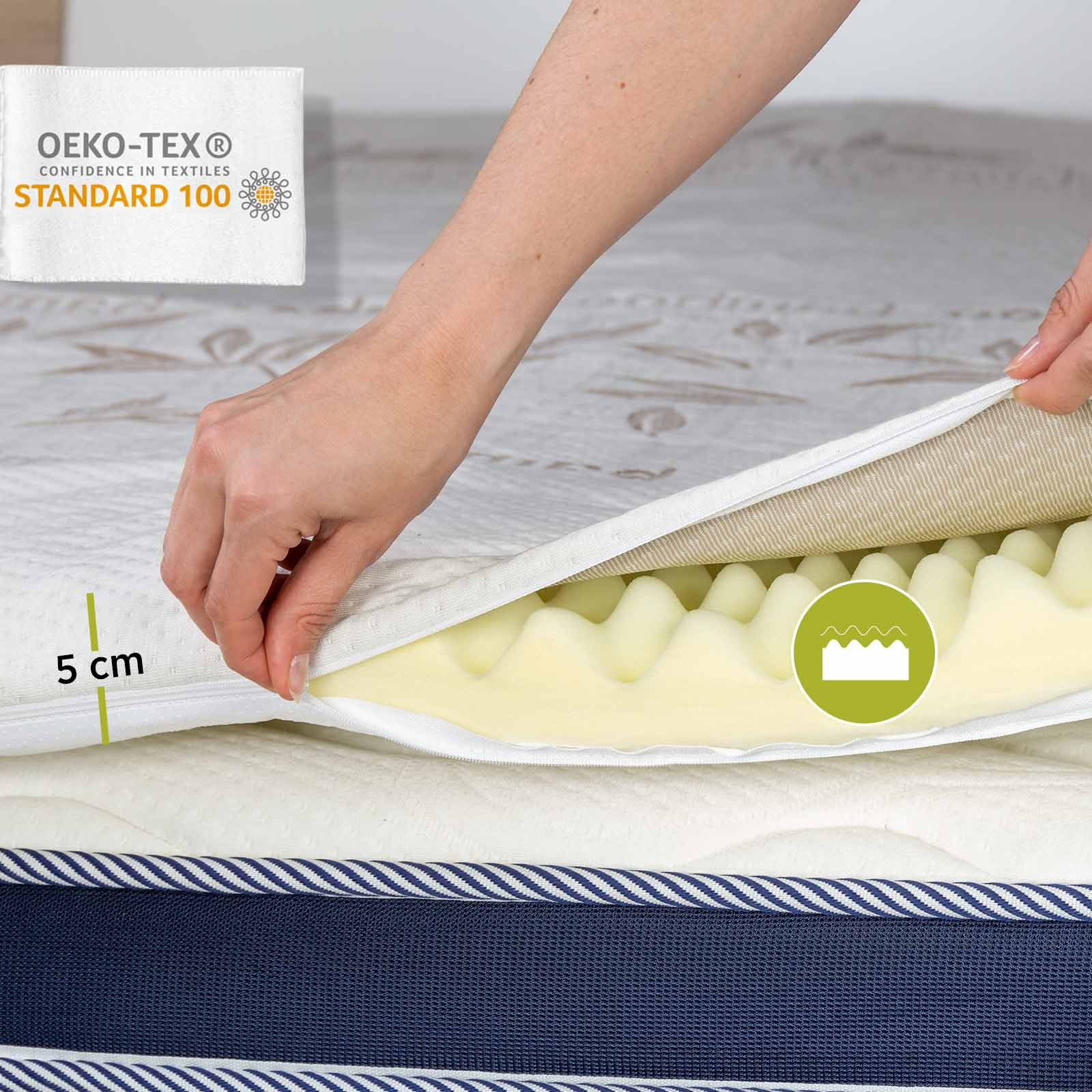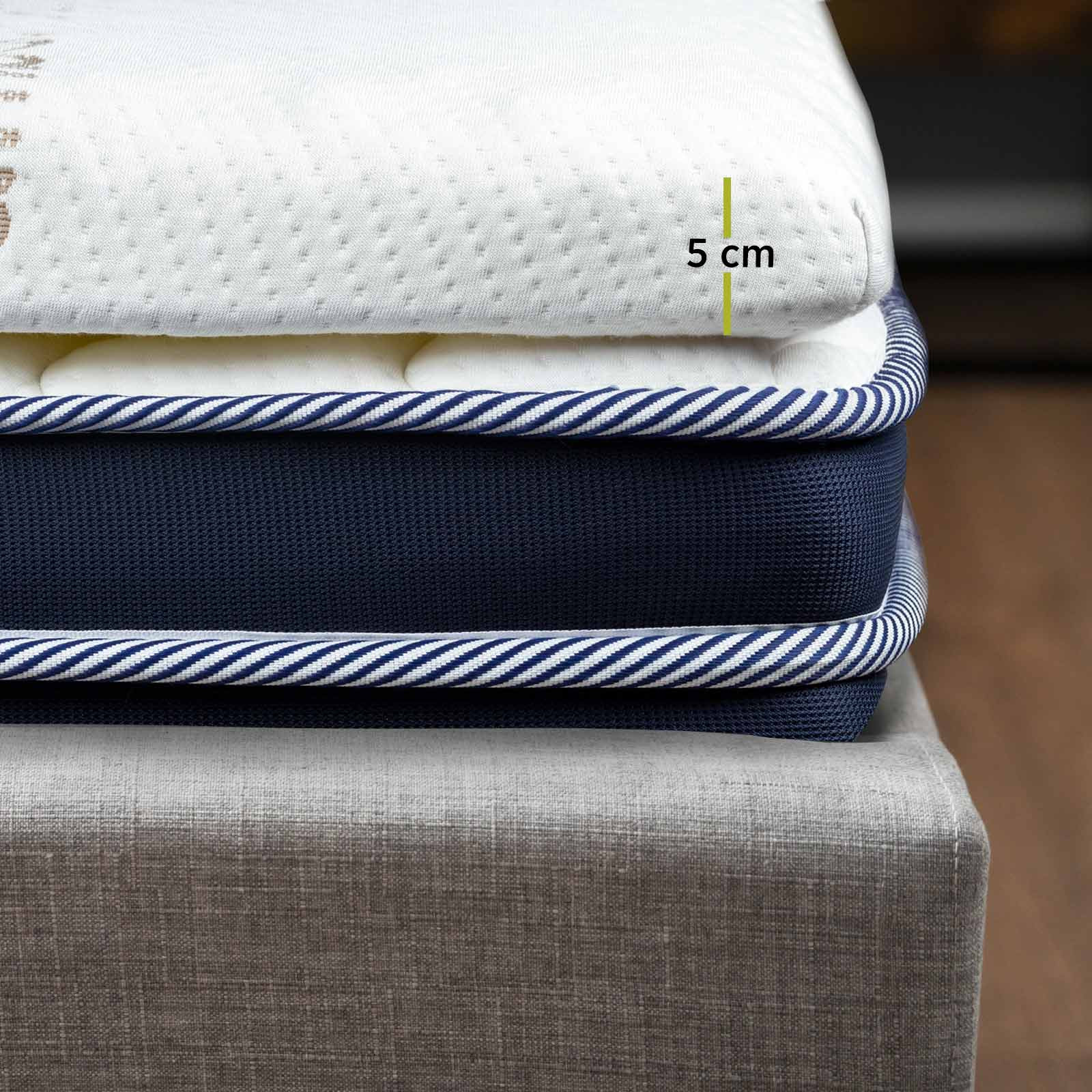| Sestava | Jedro: 100 % poliuretan (pena 5 cm). Zgornja stran tkanine: 40 % viskoza (bambus), 60 % mikrovlakna. Spodnja stran tkanine: 100 % mikrovlakna. |